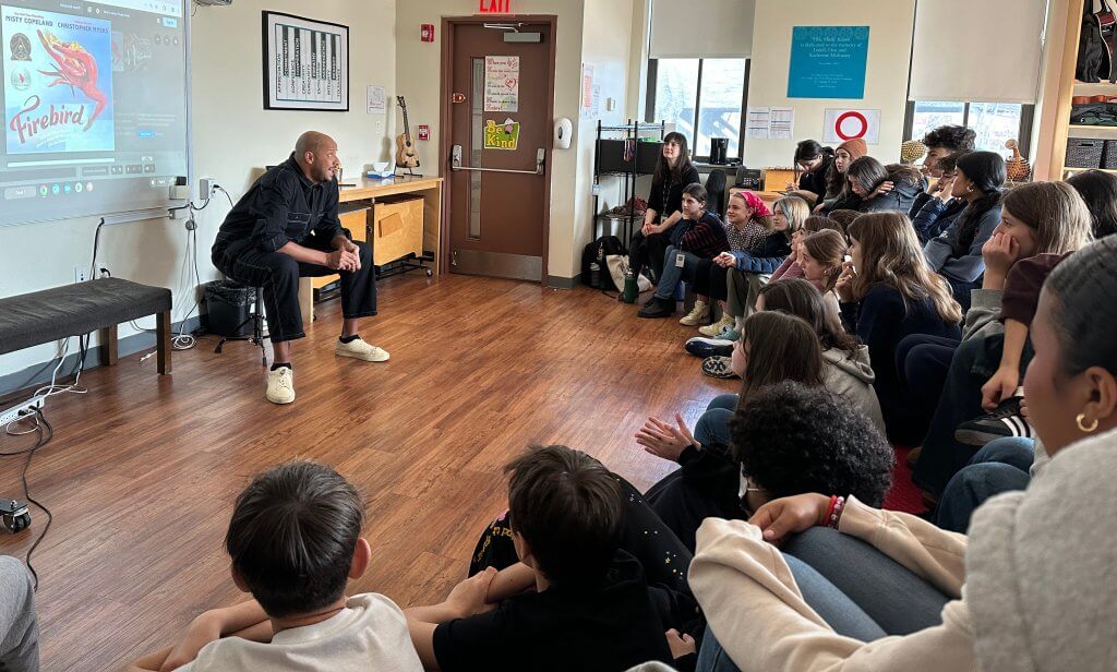 Later in the day, Christopher met with our 8th Graders to talk about his interdisciplinary, multimedia artwork. He spoke about how he uses quilting, stained glass, and sculpture to tell stories that would otherwise go unheard while collaborating with artists and craftspeople from all across the globe. Christopher also talked about his work in publishing and how, for his imprint at Random House, he seeks out joyful stories with strong, diverse characters, always keeping in mind if a writer is telling a story that “I’d like my child and other kids I know to hear.”